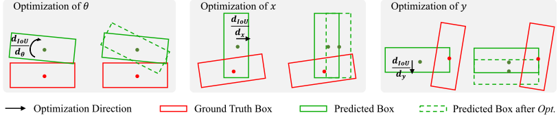 本文主要关注的是第二个问题,并做了细致讨论,作者认为:将旋转角与3D物体的中心点和形状进行耦合不利于3D IoU的优化。如下图所示: