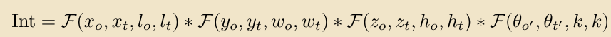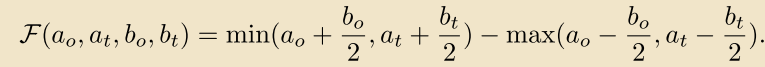 作者为了解耦角度对IoU的影响,比较有趣地引入了第四维度地概念,将角度视作类似于3维bbox中长宽高之外的第四维度,然后重新计算四维空间的“IoU”。3D box表征由中心和形状组成,变成四维就是中心和形状。对于这个4D的表征,个人感觉可以理解成四维空间的的“水平包围框”,从而不难理解作者的IoU计算方式了。IoU表达式很简单: