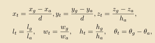 其中d是anchor在2D平面上的对角线长。ps: 实际上很多方法,包括作者的实现代码使用的并不是这种做法,而是类似2D通用检测的anchor offset encoding(参考Faster RCNN)。