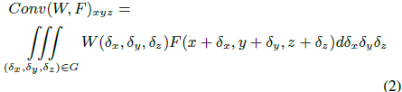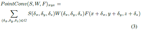 W和F均为连续函数,(x, y, z)是3D参考点的坐标,(δx, δy, δz)表示邻域 G 中的 3D 点的相对坐标。点云可以被视为来自连续空间的非均匀样本。上式可以离散化到一个离散的3D点云上。