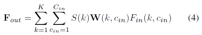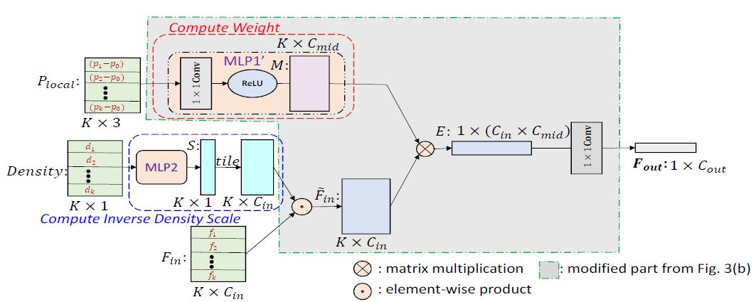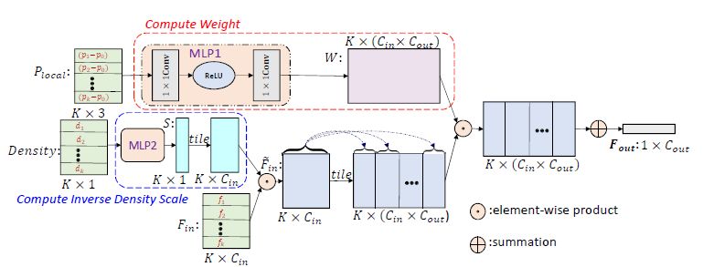 图2展示了K个3D点组成的邻域上执行PointConv操作的流程。Cin,Cout为输入特征和输出特征的通道数,k,cin,cout表示索引。输入是点Plocal的邻域位置,其可以通过减去局部区域的质心的坐标和局部区域的特征Fin来计算。我们使用核为1的卷积构成多层感知机。权重函数的输出是W,密度尺度为S。在卷积后,K近邻邻域的特征Fin被编码到输出特征Fout中,如等式(4)所示。