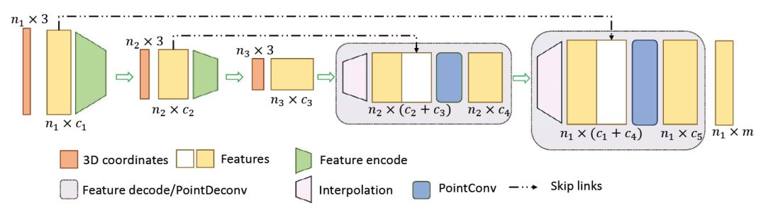 然后,使用跳跃连接将插值特征与来自卷积层的具有相同分辨率的特征连接起来。然后在连接特征上应用Point-Conv以获得最终的反卷积输出。直到所有输入点的特征已传播至原始分辨率。