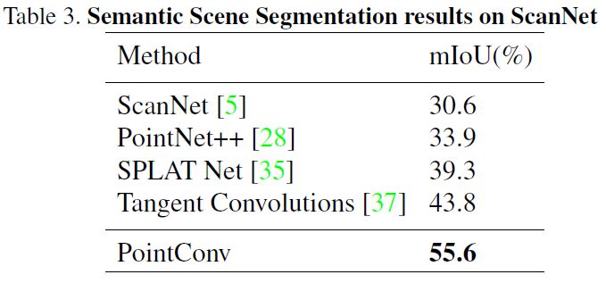 语义场景标签,使用Scan-Net数据集评估PointConv处理包含大量噪声数据的真实点云的能力。mIoU是所有类别中IoU的平均值。见表3,PointConv在很大程度上优于其他算法。