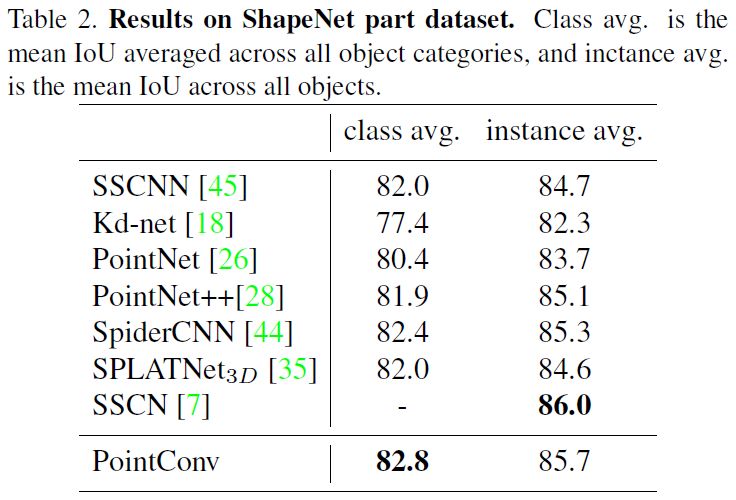 ShapeNet部分分割,使用IoU评估PointConv网络。见表2,类别平均mIoU为82.8%,实例平均mIoU为85.7%,与其他先进算法相同。