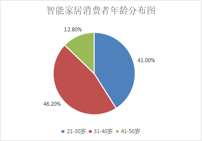 从智能家居消费用户年龄分布上来看,87.2%的消费者集中在21-40岁,12.8%的消费者集中在41-50岁,