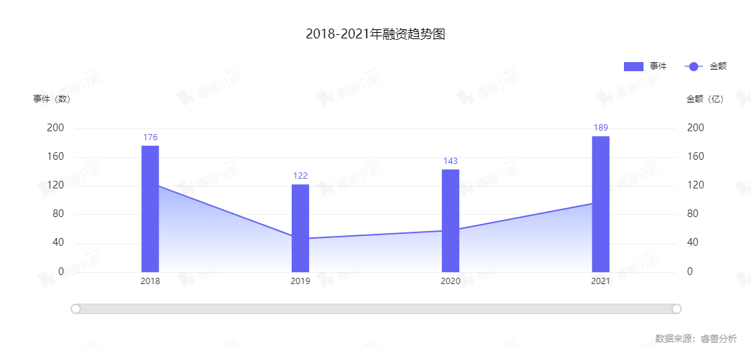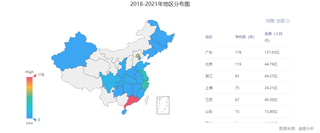 睿兽分析数据监测,2018-2021年中国一级市场投融资交易事件排名靠前的地区分别是广东、北京、浙江、上海和江苏,融资金额最高为137.65亿人民币。