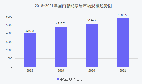 数据显示,2018-2021年我国智能家居市场规模由3997.5亿元增至5800.5亿元,预测2022年我国智能家居市场规模可达6515.6亿元。未来,随着国内移动终端的普及和物联网的推广,预计智能家居发展将进一步提速,市场增长潜力巨大。