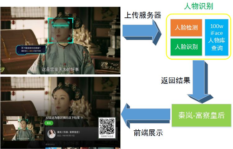在人脸识别方面的进步得益于爱奇艺创建的明星人物库,收录了 100 万多知名明星或不太知名的艺人,同时,爱奇艺 AI 技术会监听热搜、播放 VV 等多方数据,将大家感兴趣的明星人物自动同步到爱奇艺明星人物库,完成人脸识别模型的快速更新。