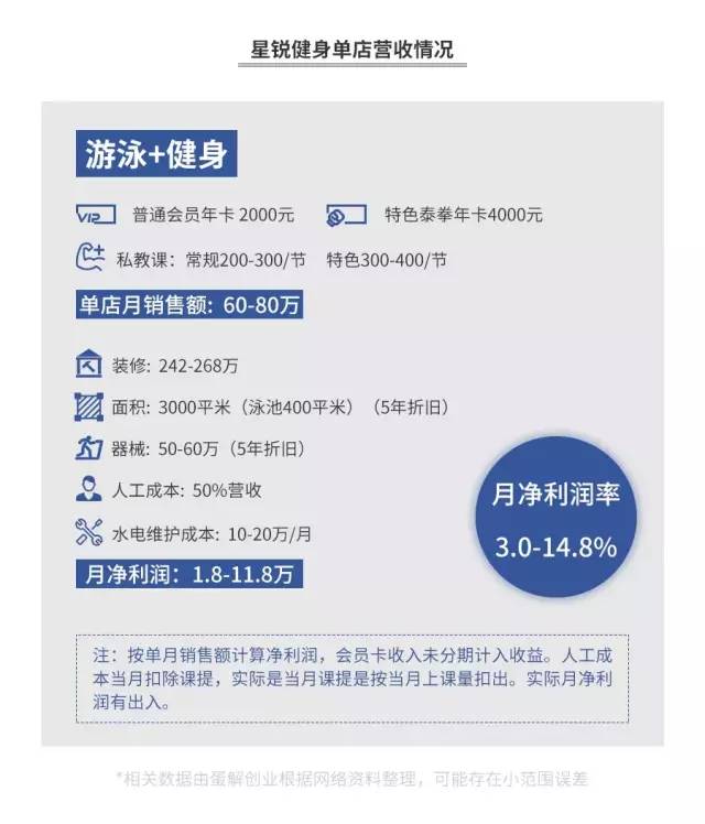 星锐健身一家门店房租大约8万,装修成本700-800元/平米,其中泳池15*25米,粗算400平米,装修费60万,算下来整体装修成本在242-268万,计算取折中255万,器械用的是国产50-60万,这两项按5年折旧,每年一共约62万,每月5.2万,水电维护成本10-20万/月,折中取15万;人工成本占营收50%。算下来单月净利润只有1.8-11.8万,净利润约3-14.8%。