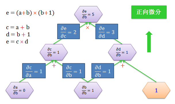 从 b 开始正向往上计算所有节点上的变量对 b 的导数,该操作叫做正向微分 (forward-mode differentiation)