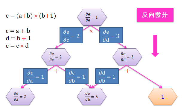 从 e 开始反向往下计算 e 对所有节点上的变量的导数,该操作叫做反向微分 (backward-mode differentiation)