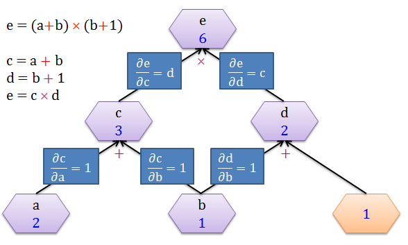 用 c = a + b,d = b + 1 的代换,画出下面的计算图 (computational graph)。图中有三个运算符:2 个加法 (+) 和 1 个乘法 (×)。紫色六边形里面的是变量,橙色六边形里面是常数。