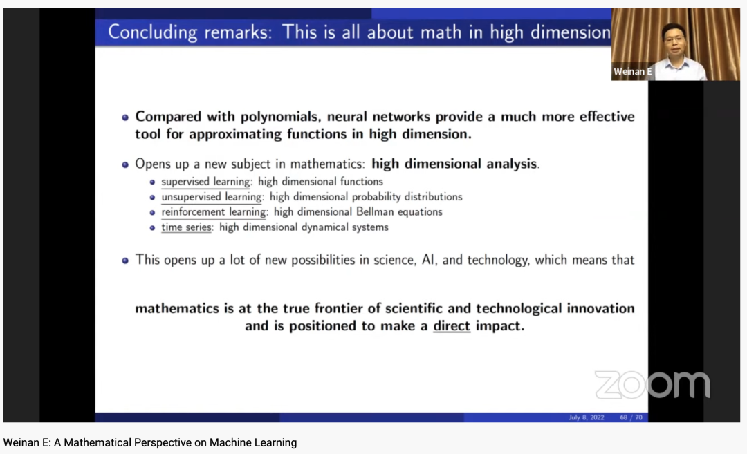 北京时间 2022 年 7 月 8 日晚上 22:30,鄂维南院士在 2022 年的国际数学家大会上作一小时大会报告 (plenary talk)。今天我们带来鄂老师演讲内容的分享。鄂老师首先分享了他对机器学习数学本质的理解(函数逼近、概率分布的逼近与采样、Bellman 方程的求解);然后介绍了机器学习模型的逼近误差、泛化性质以及训练等方面的数学理论;最后介绍如何利用机器学习来求解困难的科学计算和科学问题,即 AI for science。