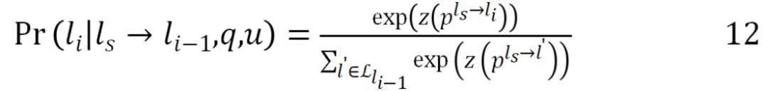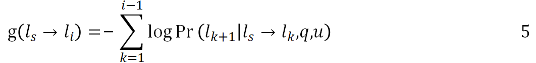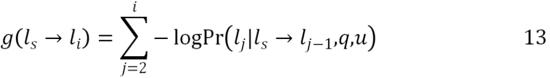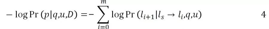 前面已经说过了,我们的任务目标是最大化 Pr(p|q,u,D),它等同于最小化负对数 -logPr(p|q,u,D)。给出一条可能的路径 p:ls→l1→l2…→lm→ld,我们可以将路径的概率分解为各个项之和。