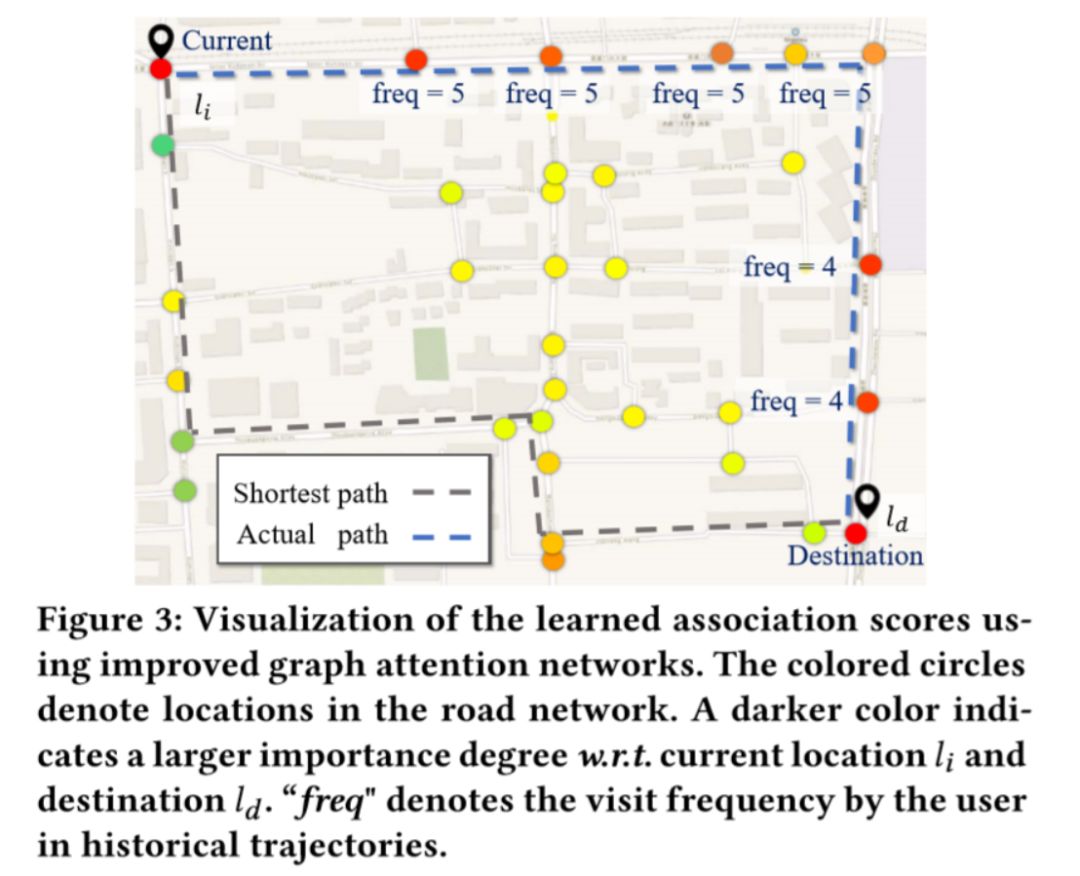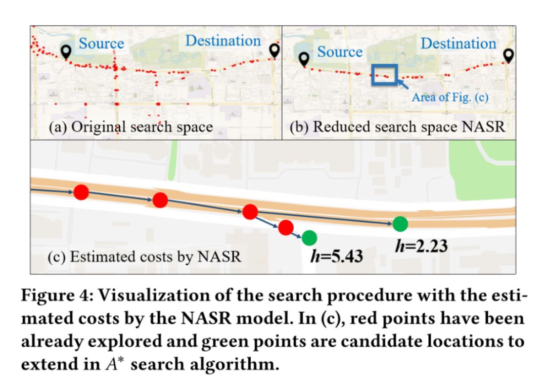 图 3 展示了图注意力机制的有效性,我们可视化了路网上每个节点与起点和终点的相似度之和,可以发现,通过图注意力机制,我们的模型可以更多地关注那些可能经过的路网上的节点。而图 4 则展示了我们 h 网络的有效性,通过 h 网络,算法的搜索空间被大大减小了,避免了很多无谓的搜索。