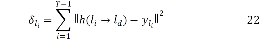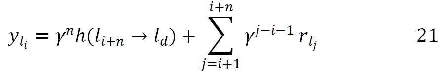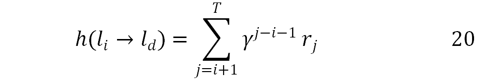 是 li 和 ld 之间距离的表示向量。最后,为了对 h() 网络进行训练,我们采用了时间差分的方法。首先我们将用户运动的过程定义为一个马尔可夫决策过程,对于每一次位置的转移,都会得到一个奖励,我们将奖励定义为如下形式。