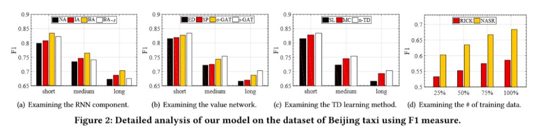 表 2 是模型的性能,对比的都是经典或者最新的算法,可以看出本文的模型表现最佳。图 2 展示了注意力机制,图注意力神经网络以及时序差分学习对于性能的帮助。