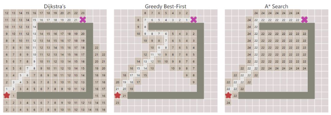 上图是三种搜索算法的对比,Dijkstra 算法只使用 g(n), 虽然可以找到最优路径,但是搜索空间巨大。贪心的最佳优先(Greedy Best-First)算法只使用 h(n),虽然减小了搜索空间,但是不能保证得到最优的结果。而 A* 算法可以保证得到最优路径,并且大大减小了搜索空间。