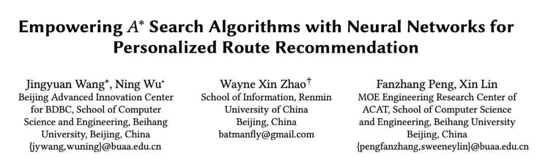在现有工作中,大家往往以简单的统计或者浅层的模型来作为搜索的费用函数,但是用户的喜好往往是难以被如此简单地建模的,因此,我们提出用神经网络来学习 A* 搜索算法中的费用函数,以此为基础结合 A* 搜索算法来完成个性化的路径推荐。本文 Empowering A ∗ Search Algorithms with Neural Networks for Personalized Route Recommendation 已经被 KDD 2019 收录,可以通过 https://arxiv.org/pdf/1907.08489.pdf 下载。