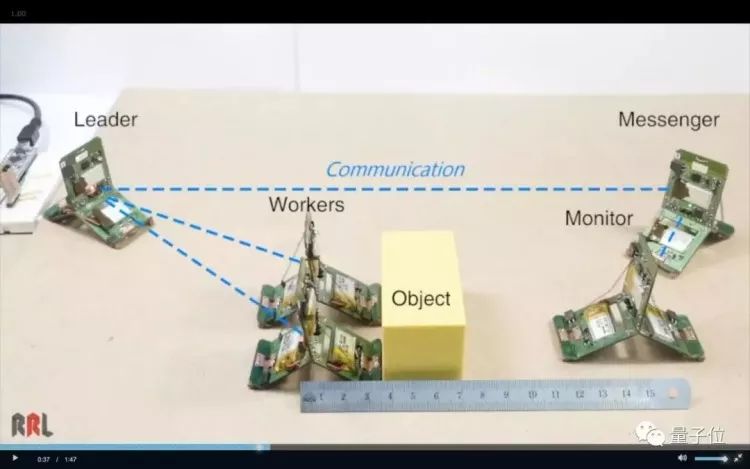 实验表明,这样一个简单的任务仍需要五个Tribot才能完美完成:两只“工蚁”将物体推向监工,监工用距离传感器测量方块与自己的相对距离,然后通知这个任务的指挥官。指挥官会根据这个反馈来命令“工蚁”继续前进或停止推动。