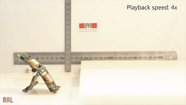 如果这个过程发生在铰链底部,Tribot就会垂直上跳。如果这个过程发生在铰链两侧,机器人则会做出类似立定跳远的动作,这也是它跨越障碍的主要方式。当然啦,结合两种方式,以翻筋斗的动作来跨越复杂地形对于Tribot也并非难事。