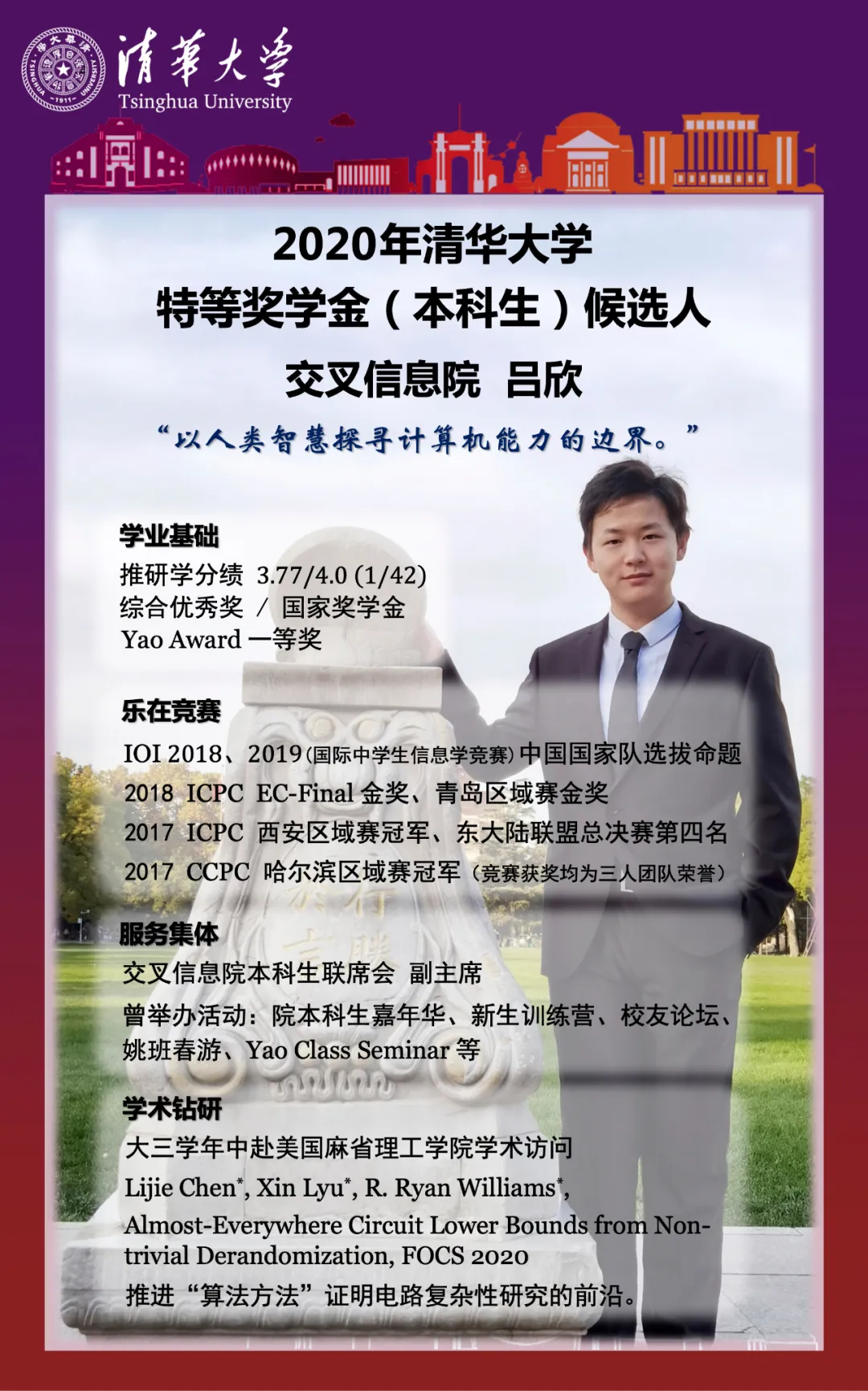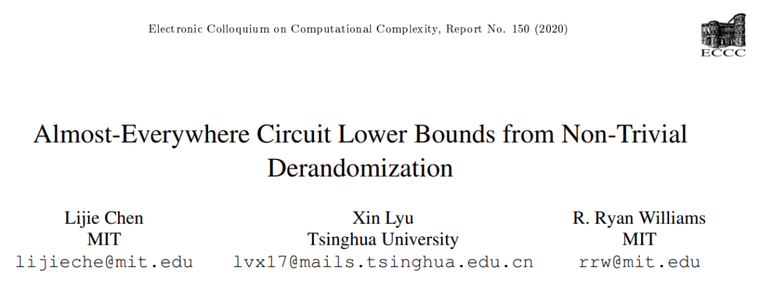 在大三那一年,吕欣曾前往 MIT 进行学术访问,并在 IEEE 计算机科学基础研讨会 FOCS 2020 发表论文《Almost-Everywhere Circuit Lower Bounds from Non-Trivial Derandomization》,合著者包括姚班师兄、2016 年清华特奖得主陈立杰。该论文对「算法方法」证明电路复杂性研究起到了重要的推动作用。