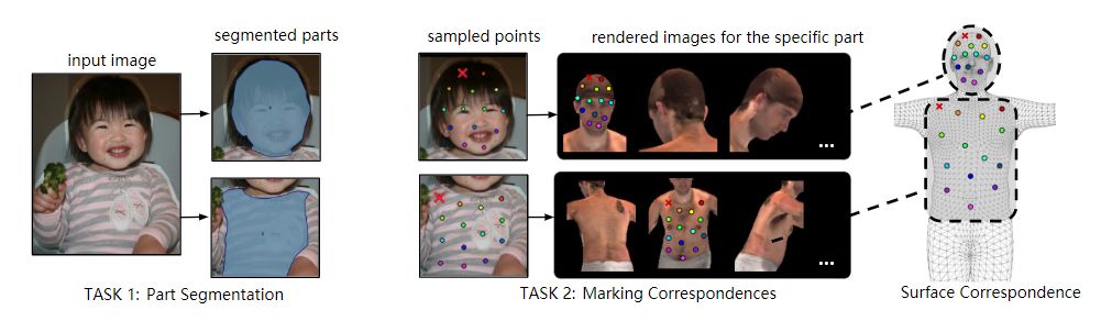 Facebook则另辟蹊径,提出了一种更为丰富,考虑人体3D表面信息的姿态表示Densepose(http://densepose.org/):