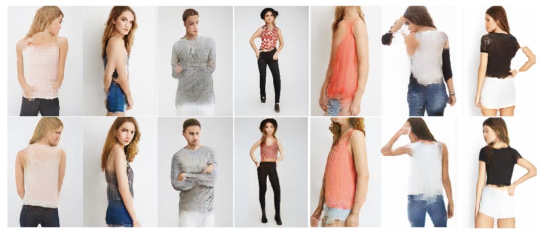 与Deformable GAN相比,Dense Pose Transfer由于在姿态表示中融合了人体表面纹理信息,从而能够更好地保持衣着纹理细节,并有效解决一部分的遮挡,断肢等问题。下图中第一行为Deformable GAN的结果,第二行为Dense pose transfer的结果: