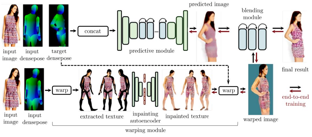基于Densepose表示,Facebook进一步提出了Dense Pose Transfer,通过融合生成网络预测(predict)模块及人物纹理形变(warpping)模块的结果来获得更为鲁棒的人体姿态外观表征:
