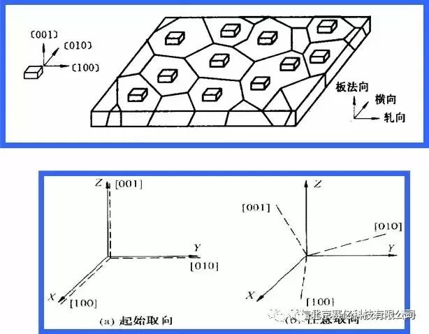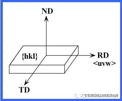 晶体的[100]-[010]-[001]坐标系CCS相对于样品坐标系SCS:RD(rolling direction, 轧向)-TD(transverse direction, 横向)-ND (normaldirection,法向)(或X-Y-Z)的位置关系。