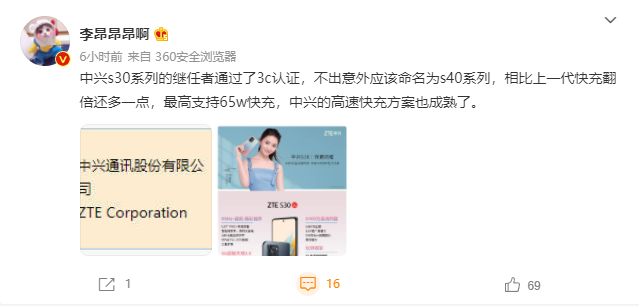 此外,中兴一款型号为 ZTE 9040N 新机近日通过了 3C 认证,该机支持 65W 快充,据爆料或将是中兴 S30 手机的继任者,命名有望为 S40。