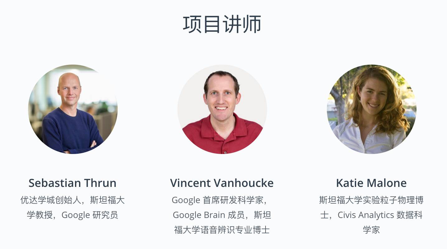 • 豪华讲师阵容在线教学。无人车之父 Sebastian Thrun 和 Google 一线科学家、斯坦福大学博士亲授。