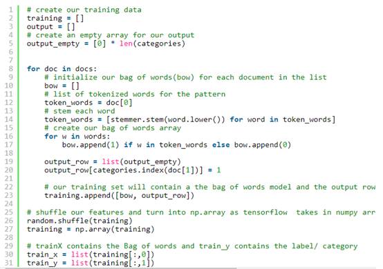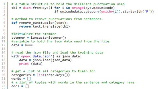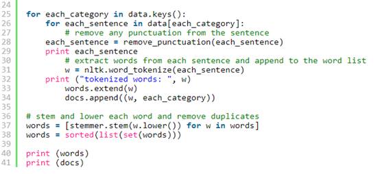 在上面的代码中,我们创建了多个列表。words列表包含有从所有用于训练的句子中提取出来的具有唯一性的词语。Categories列表包含所有的类别。