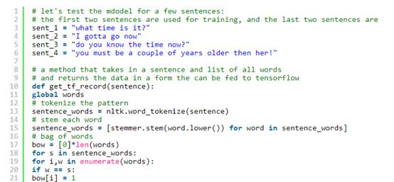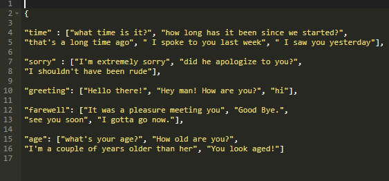 上面我们创建了一个具有五个类别的简单JSON类(time,sorry,greeting,farewell 和age)。对于每一种类别,我们都有一些对应的句子用于训练模型。有了这些数据,我们必须将任何句子归于与以上五类中的一类。