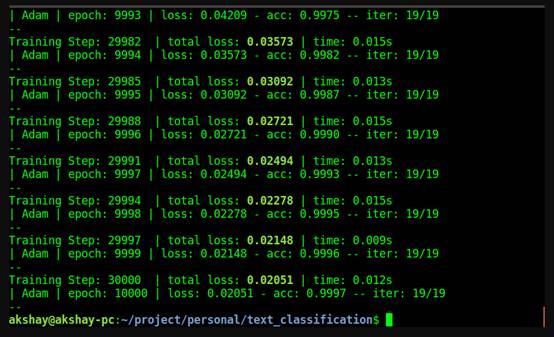 以上代码中训练次数为1000次。我训练了10000次,10000次包含了30000步,这花费了2分钟完成。
