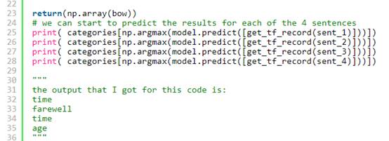 现在我们可以通过以下的代码来测试我们的神经网络文本分类器python模型了。