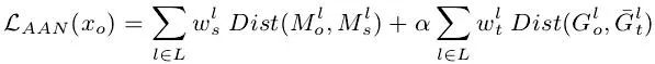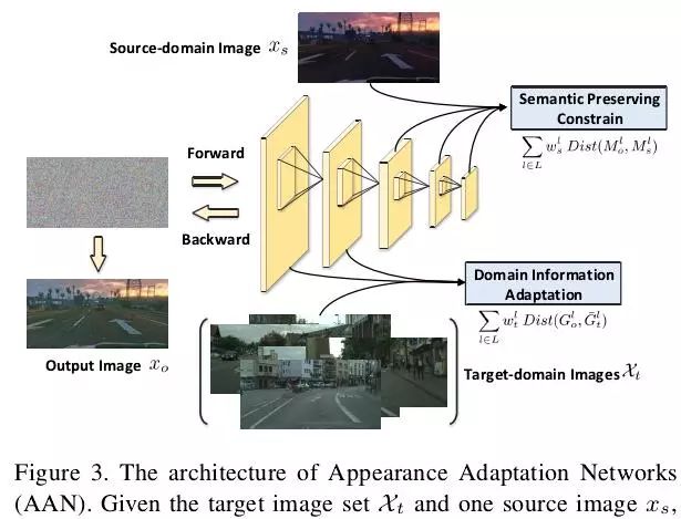 图3展示了图像域适应网络AAN的具体细节和处理流程,熟悉style transfer的同学其实已经发现了它本质上就是一个图像风格转换网络,其实现思路也是和CVPR2016的这篇文章[1]类似的,这里简单阐明一下实现思路:输入是一张高斯白噪声图像,输出图像是在网络反向传播的过程中不断更新得到的,训练的损失函数包含两部分:内容上和合成图像尽可能接近,风格上和真实图像尽可能接近,因此整个AAN的损失函数如下式所示: