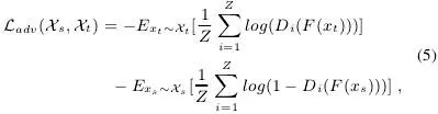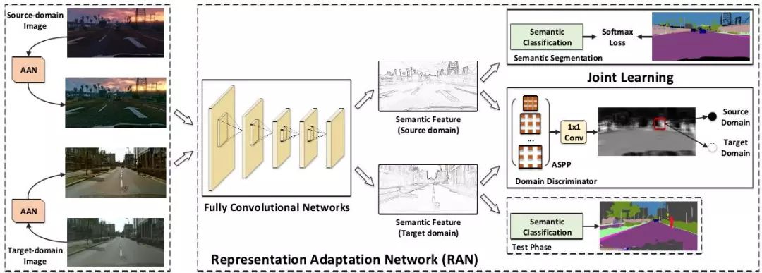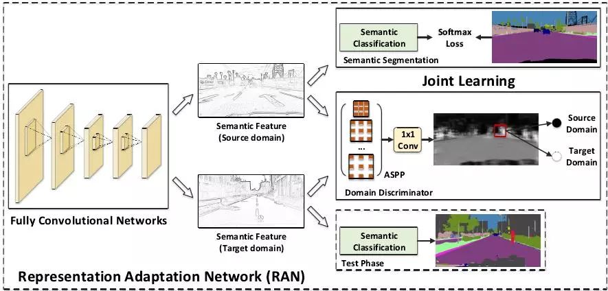RAN的目的是为了使得基础网络FCN提取的特征具有域不变性,其本质上是个生成对抗网络,其中的生成器G是上图中的基础网络Fully Convolutional Networks,用于提取来自两个域的图像特征;判别器D是上图中的Domain Discriminator,用于判别特征来自源域还是目标域。对于源域的合成图像而言,该特征分别输入两个分支:一是上图中的语义分割分支,利用合成图像的标签进行有监督训练,损失函数是正常的逐像素分类损失;二是输入上图中的Domain Discriminator,同时来自目标域的图像特征也输入到Domain Discriminator,生成器要利用生成的特征使得Domain Discriminator判别不出来来自哪个域,而Domain Discriminator则要尽可能判别正确,这就构成了一个对抗过程,对应的对抗损失如下式所示: