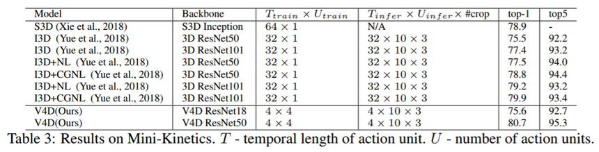 为了进行公平的比较,我们遵循 Nonlocal 和 Slowfast 使用了 FCN Testing。我们从整个视频中均匀地抽取 10 个动作单元,用 3 个 256×256 区域对每个动作单元进行空间覆盖,然后进行 V4D 推理。注意,对于原始的 TSN,在推断期间使用 25 个片段和 10-crop 推理。为了公平比较 I3D 和 V4D,我们对 TSN 也应用 FCN Testing 这种 10 个片段和 3-crop 的推理策略。
