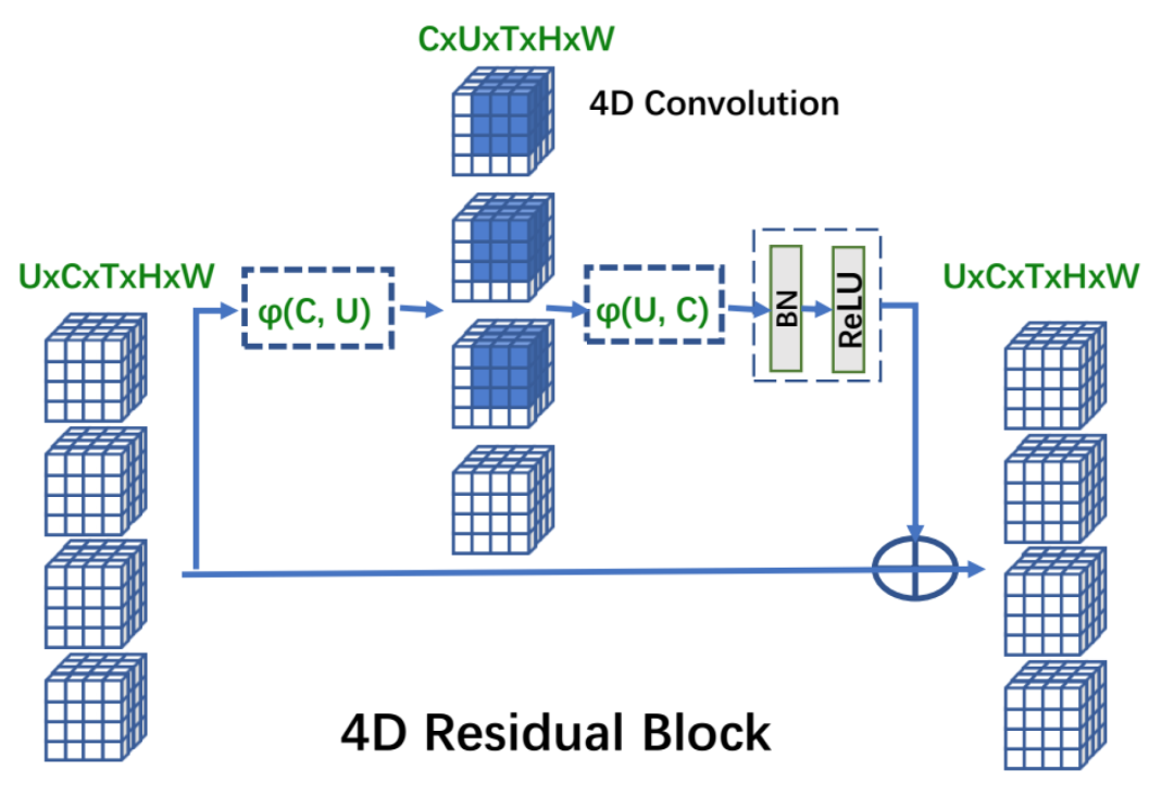 我们将 4D 卷积加入到现有的 CNN 结构中。为了充分利用当前效果较好的 3D CNN,我们提出了残差 4D 模块,这使得同时学习视频级别的短程和长程时空变化成为可能。特别地,我们定义一个交换函数,,用来交换张量