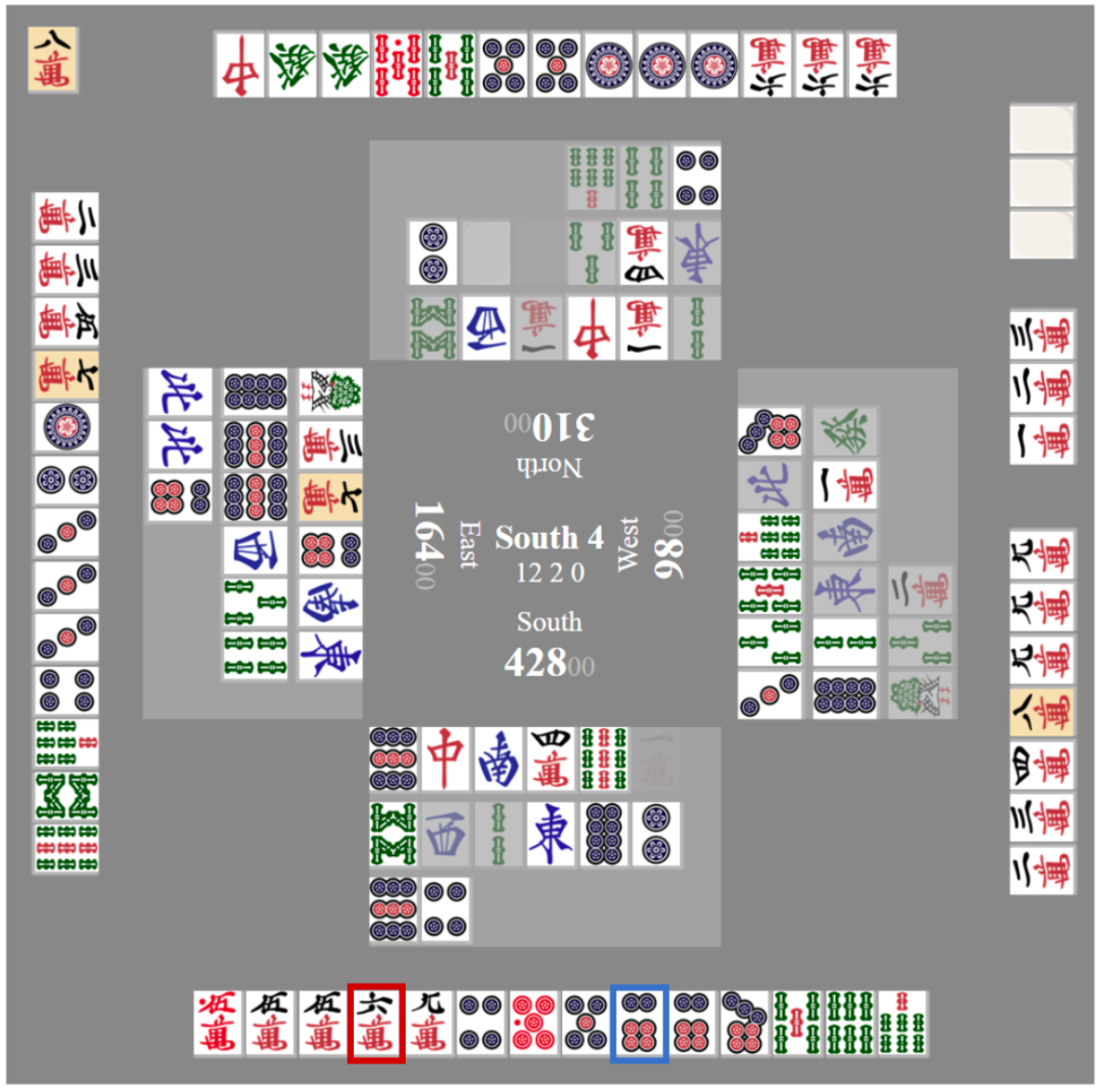 通过全局奖励预测器将游戏奖励分配到每个回合,训练有素的智能体能够更好地将最终游戏奖励最大化,而不只是每一回合的得分。图 9 中的智能体(朝南向的玩家)在最后一局中遥遥领先,并且抓得一手好牌。