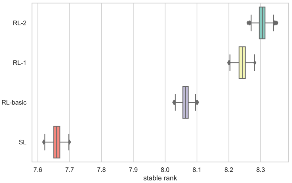 下图 8 展示了这些智能体的 1000 多个样本中稳定段位的四分位间距。