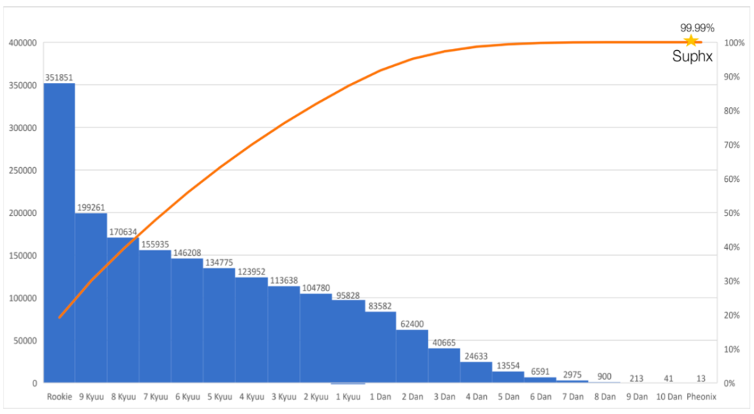 下图 10 展示了天凤上活跃用户的段位记录,Suphx 超越了 99.9% 的人类玩家。