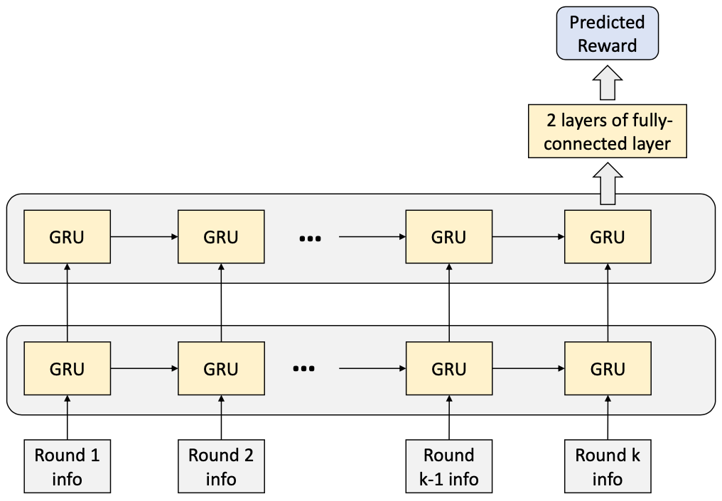 为了使得为 RL 训练提供有效的信号,需要适当地将最终游戏奖励(全局奖励)归因至每一回合游戏中去。为此研究者引入了全局奖励预测Φ,它能够根据游戏的当前回合和所有先前回合的信息来预测最终的游戏奖励。在 Suphx 中,奖励预测因子Φ是循环神经网络。具体一点,是两层门控循环单元(gated recurrant unit,GRU),以及两层完全连接的层,如下图 7 所示:
