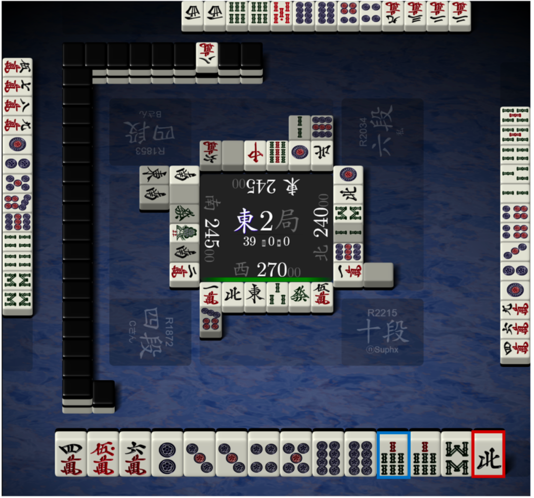 图 11:Suphx 保留了一张安全牌来平衡攻与守。一般来说,人类玩家可能会把红框里的那张牌打出去,但 Suphx 却留它在手,打了蓝框里的那张牌。这样可能会和牌慢一些,但可以为之后的出牌提供更大的灵活性。