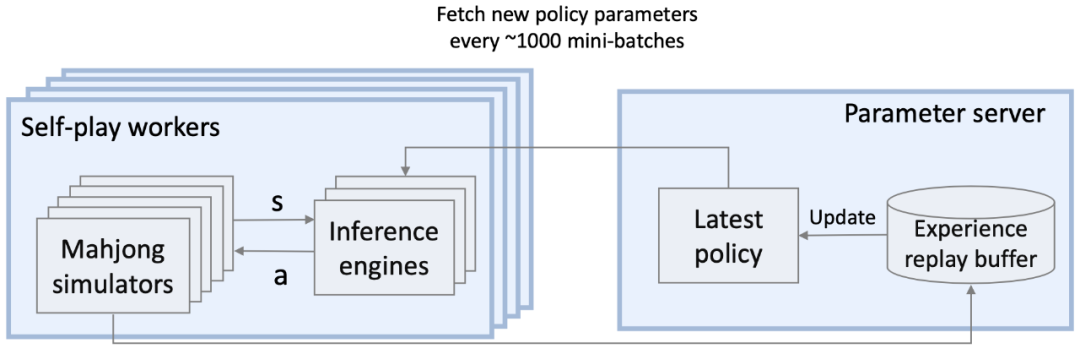 Suphx 使用的分布式 RL 系统如下图 6 所示。该系统由多个自我迭代组成,每个包含一组基于 CPU 的麻将模拟器以及一组基于 GPU 的推理引擎,以生成轨迹。策略π_θ的更新与轨迹的生成是分离的:参数服务器基于缓冲区来使用多个 GPU 制定更新策略。