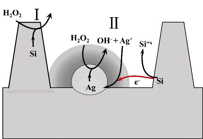 图4 两步法金属辅助化学腐蚀过程原理图。