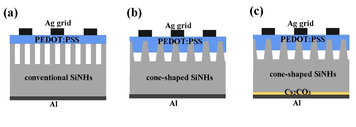 图1. 晶体硅/PEDOT:PSS杂化太阳电池结构图。(a)传统硅纳米洞结构,(b)纳米洞结构,(c)纳米洞结构结合碳酸铯钝化层。