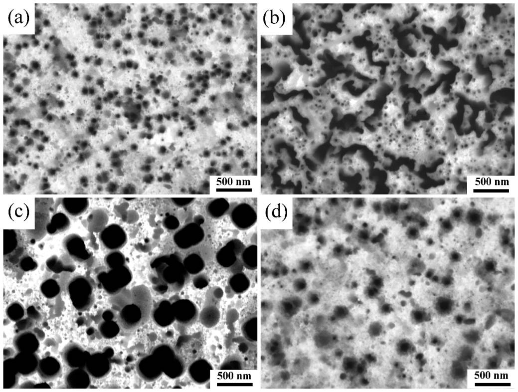 图2 不同过氧化氢浓度腐蚀液所得硅纳米结构SEM图 (a) 0.4 M, (b) 2 M, (c) 4 M, (d) 6 M。