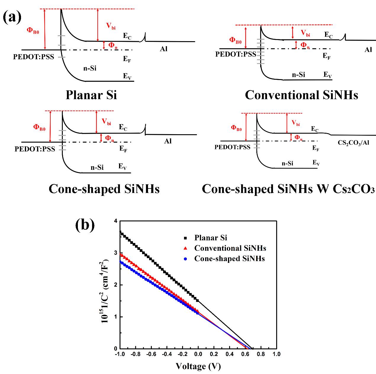 常规的有机/无机杂化太阳能电池结构是在单晶硅片上旋涂有机物PEDOT:PSS形成异质结,并在两边热蒸发或丝网印刷银和铝电极。因为平面单晶硅片的反射率较高,所以这种结构对光的吸收效率并不高。为了增强光吸收和减少对硅的使用量,硅纳米线、硅纳米锥和硅金字塔等纳米结构被用来作为陷光结构,但是这些结构使得硅和有机物之间的接触变差,极大地降低了电池转换效率。同时,N型硅与背电极接触不好导致载流子复合增强,也影响了电池转换效率。